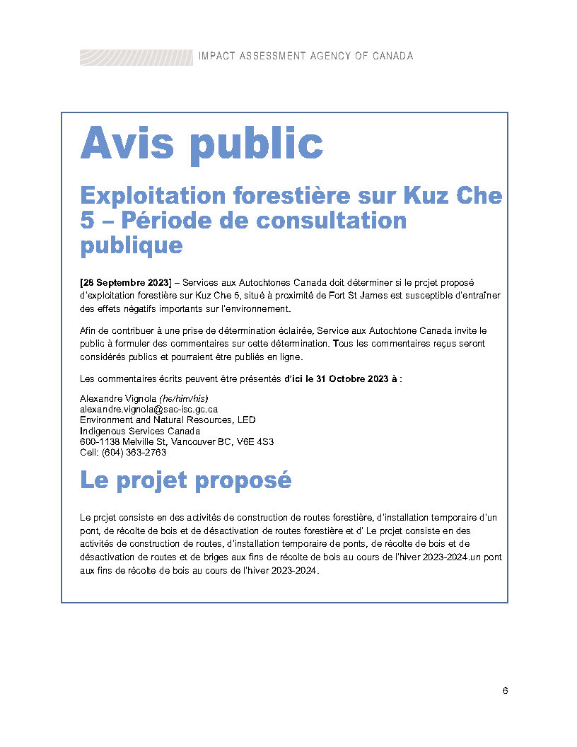 September 28, 2023 – Indigenous Services Canada intends to make a determination regarding whether the carrying out of the project is likely to cause significant adverse environmental effects. To help inform this determination, the Indigenous Services Canada is/are inviting public comments until [October 31, 2023] respecting that determination.